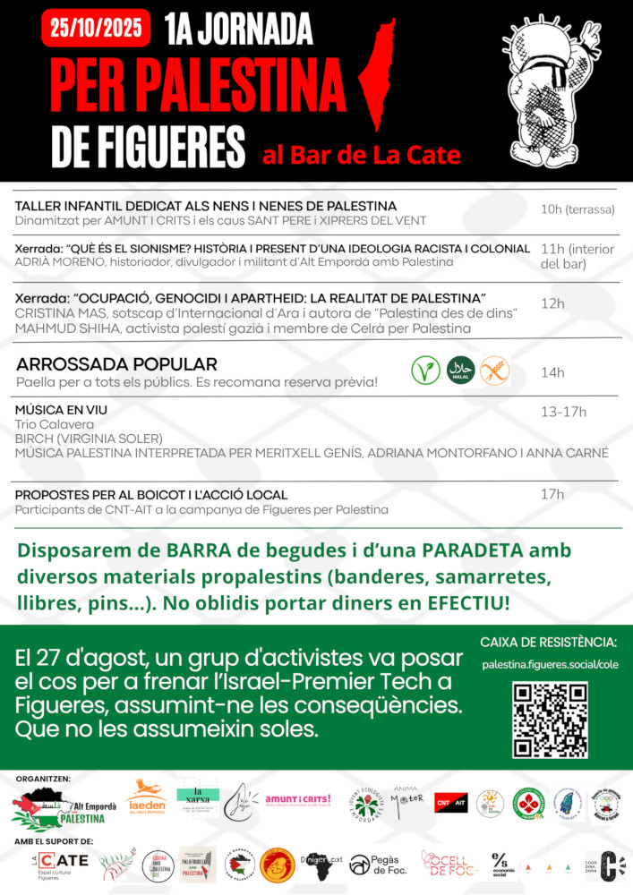 Dissabte 25 d’octubre us esperem al bar de La Cate, on celebrarem una jornada dedicada a Palestina amb música en directe, xerrades i una deliciosa paella apta per a tothom.